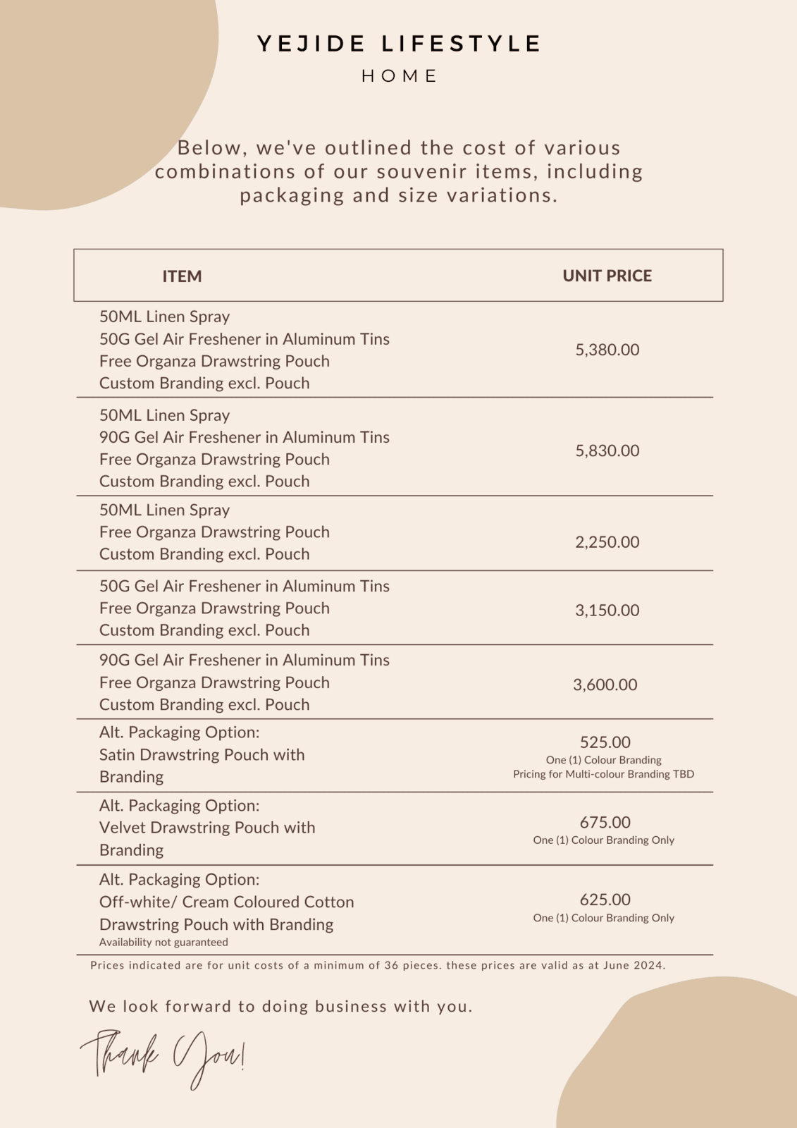 Discounted prices for bulk orders start from a minimum of 36 pieces for each item.